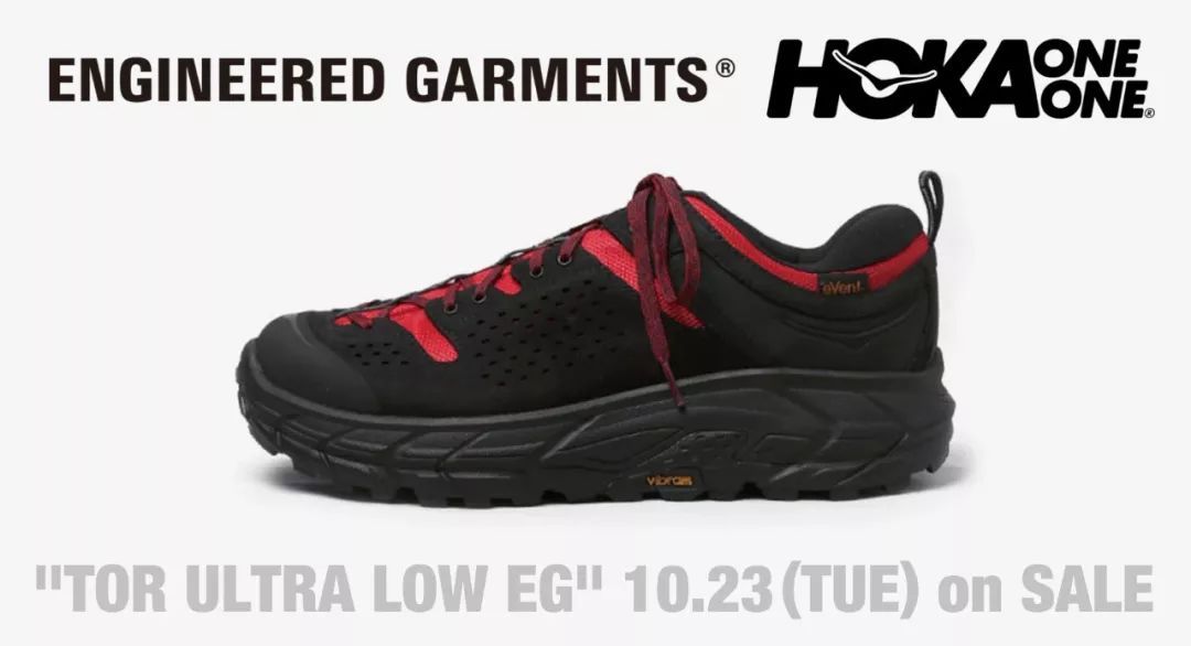 上年十月与美牌 Engineered Garments 推出的 HOKA ONE ONE Tor Ultra Low EG 鞋履,分别推出沙色、黑色与红黑色系列, 一推出时亚洲区迅间完卖。
