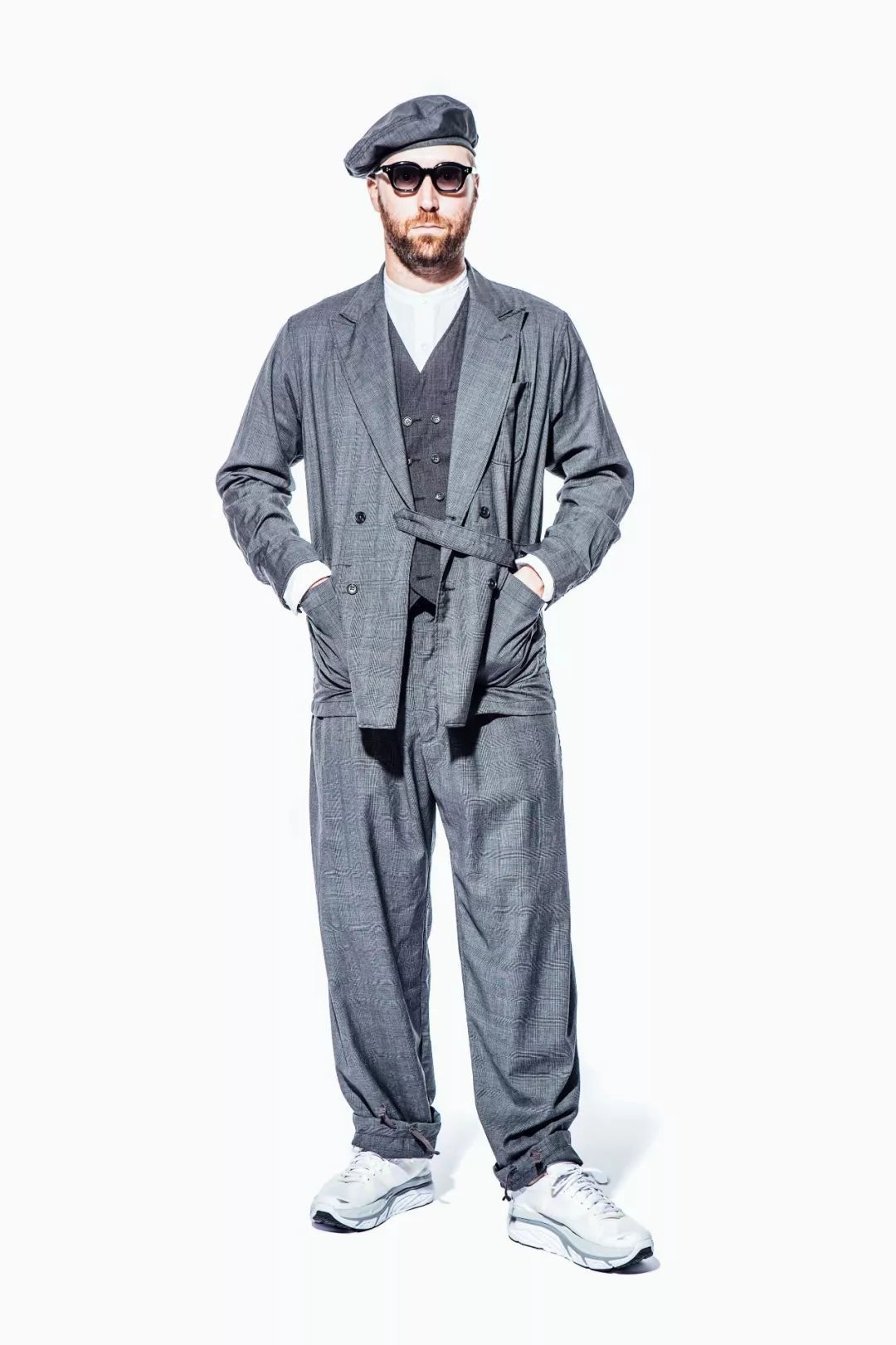 Engineered Garments lookbook 中, model 穿上 HOKA ONE ONE 的跑鞋系列。