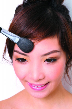 5 在鼻梁位置扫上淡金色的光影粉末,令妆效更突出。