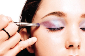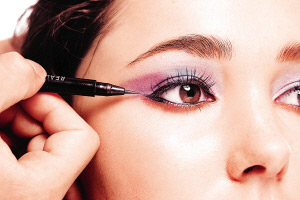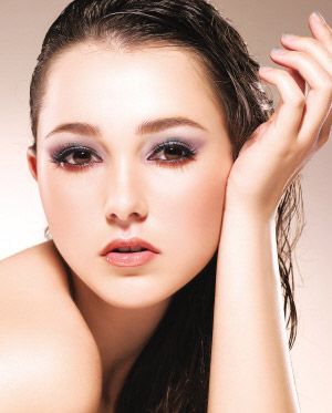 紫色其实可以很有型,不妨先使用霜状银白色眼影打底,再于眼窝中间扫上防水的彩蓝色眼影,然后,可在眼窝中间开始,向上打斜扫上深紫色眼影,仿如画一个平行四边形般,而啡红色的眼影则用来画下眼线,加以点缀,最后用液质眼线笔画下眼线更可令眼形变得更大。