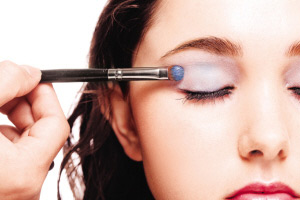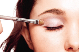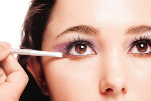 3 以眼影扫沾上深紫色的防水眼影,由眼窝中间开始,向上打斜扫开,尾部要以45度角向上斜。