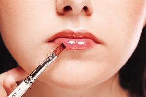 以唇扫涂上橙色带金的唇彩