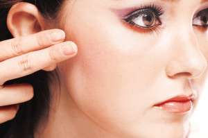 6 先以橙色膏状胭脂轻印于颧骨位之上,再用手指将之印至贴近耳部的位置,营造出自然的红润效果。