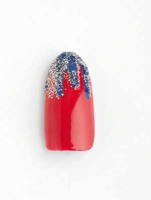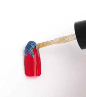 3、待蓝色甲油干透后,在上面加上带有金色闪粉的透明甲油,加强效果即可。