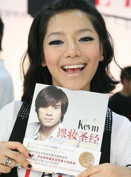 编辑点评:图中江映蓉拿着造型师Kevin老师的《裸妆圣典》,笑容可掬,纯真可爱;蓝色的眼影、长长的睫毛温婉古典,深深的黑色的眼线与同是黑色的指甲遥相呼应,粉色的腮红更是让她气色饱满,充满活力。