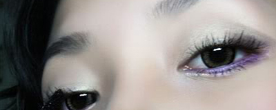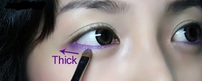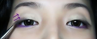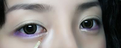 Step 3:在下眼角用珠光亮泽的薰衣草紫色眼影,沿着下眼睑的边缘按照眼尾→眼头、眼头→眼尾的顺序描画,可在眼尾1/3处适当加深。