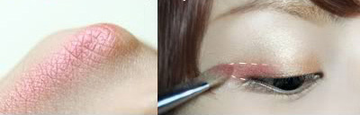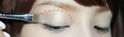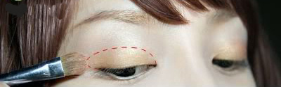 step 2 用带有亮粉的鹅蛋黄色在图中所示范围内打上眼影,注意要打出渐变的效果,而且和高光部分的衔接也要过度得自然。
