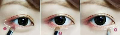 step 4 如上图所示,①处涂抹粉色眼影,②处涂抹鹅蛋黄色眼影,③处涂抹白色眼影。