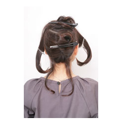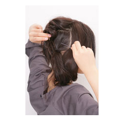 头顶的头发也同样拧绕后夹往马尾辫处,注意这时要扎得比较松散点。