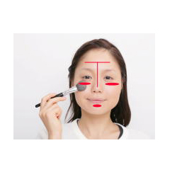 从太阳穴开始到下巴骨涂上比肤色稍微暗一点的遮瑕膏,然后用棉扑轻轻地拍打使之和肌肤很好地融合在一起。通过底妆分出层次使脸显得比较有立体感。