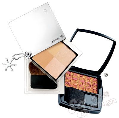 ①兰芝雪凝魔幻彩盒/305元 ②香奈儿斜纹软呢星彩腮红/新品未定价