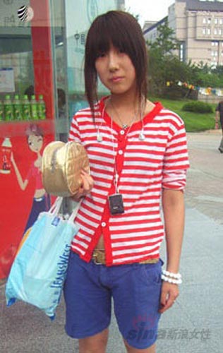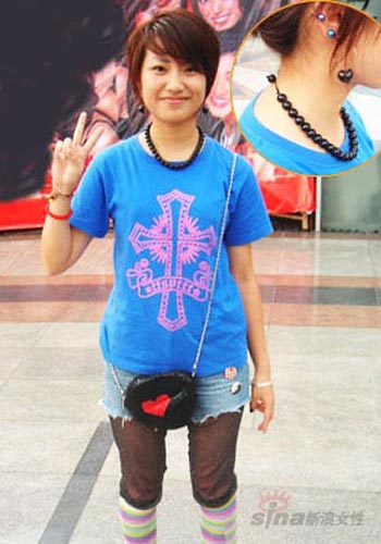 蓝粉色的短袖衬托出MM的娇好脸色,超短迷你裙+双层色调的袜套 打造超前卫的新新人类。金属链的桃心小包让人爱不释手,为可爱的甜美造型增色不少。