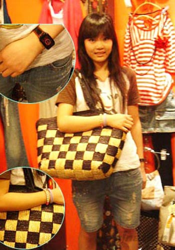 米奇仿旧短袖充满童趣,配合格子编织大包整体造型咖啡色调。磨洞仿旧仔裤和黑色船鞋,舒适又具有时尚的复古感觉。