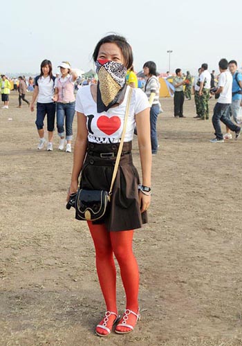 漆皮,豹纹是大红色最好的映衬,美丽的腿才能穿这样的袜子呢,高腰裙里的Tee掩藏着一颗红心,折进去的围巾隐隐露出一抹红色,这个MM真是很显眼!