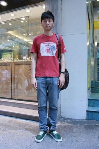 中规中矩的小男生一到夏天还是钟爱板鞋牛仔裤,小链子也不忘记挂一条,虽然有点呆板,但也都在搭配的条理之中。