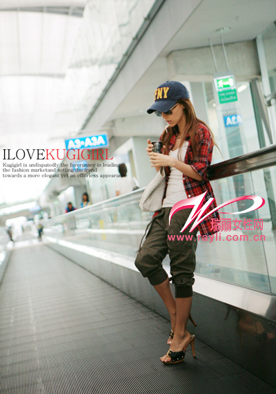 红色格子衫与军绿色七分裤得撞色搭配,十分亮眼,随意又时尚!