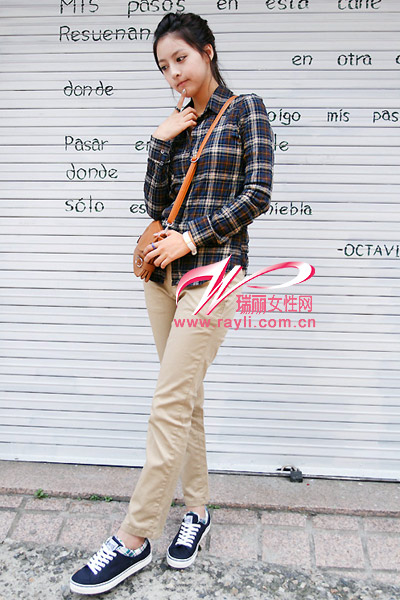 红白格子衫是潮人必备的人气单品,搭配棕色紧身裤,轻松穿出时尚感!