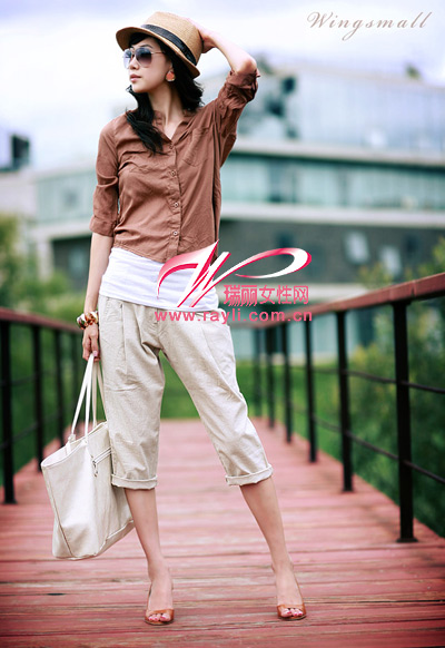 咖色小衬衫搭配米色卷边七分裤,低调而休闲的搭配让你轻松购物!