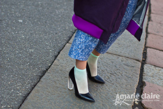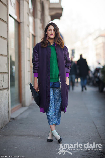 Eleonora的穿衣风格一向像名字一样华美。暗紫色的优雅与青葱色的young感形成鲜明的对比。衬衣露出的领尖与底摆正好与青莲色的外衣边相呼应。丝袜属于另一个季节,可是用裸腿的部分做过渡,再优雅不过。