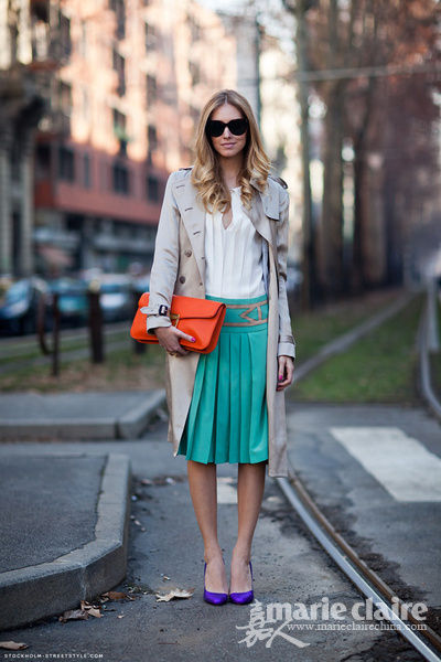 撞色风行之时,色彩的搭配便开始百无禁忌。荧光色无处不在,从前一件即可成为“土气”的代言词今季却大行其道,开始家族式的扩展。手拿包+百褶裙是今年的街头流行趋势之一,而如果你是个喜欢玩小心思的时尚爱好者,利用风衣的严谨与酷帅中和荧光亮也是不错的办法。