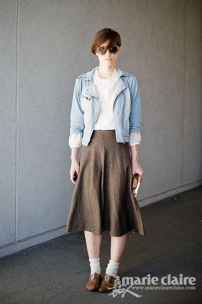 粗呢A字半裙是比较艺术感的单品,搭配件牛仔外衣能让你看起来更混搭一些,而短袜不仅是今年大热的趋势之一,也能让你看上去搭配感更高一些,记得这个时候你一定不要简单的穿一双高跟鞋,复古牛津鞋与短发的搭配才会让你看起来更加有风格。
